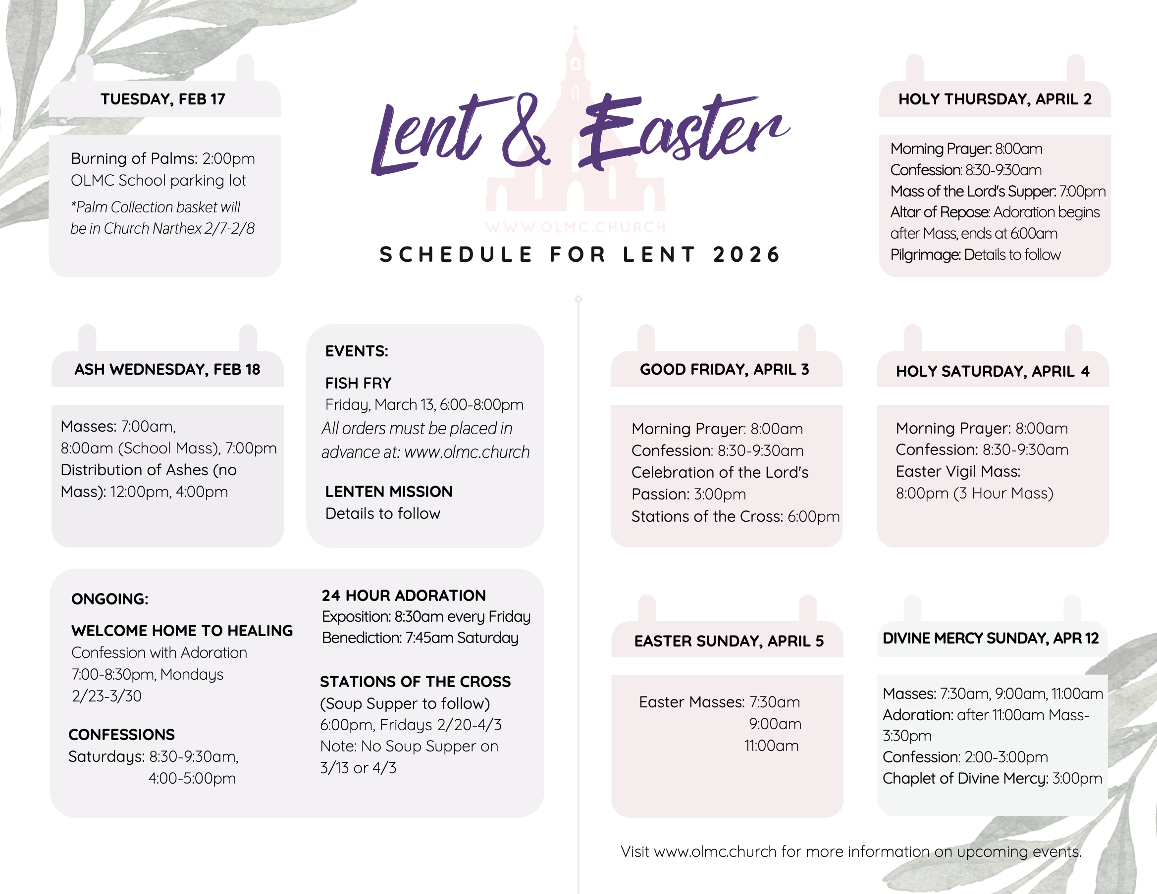 During Lent, our regular schedule of Masses, Confession Times, and Adoration continues.